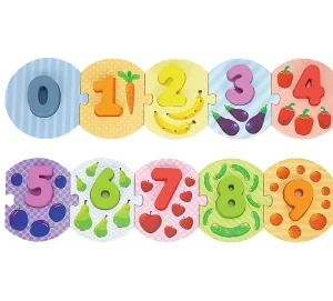 Układanka do nauki liczenia lubianej i popularnej marki Trefl. Zestaw zawiera drewniane cyferki od 0 do 9 wraz z tekturowymi podkładkami. Na każdym puzzlu znajduje się grafika z ilością warzyw lub owoców odpowiadająca danej cyferce, a namalowane strzałki wskażą kolejność oraz kierunek.