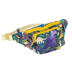 Stylowa saszetka z paskiem ozdobiona motywem dinozaurów. Saszetka posiada pojemną komorę główną i przednią kieszeń, obie zamykane na wygodne suwaki z breloczkami w kształcie dinozaurów. Regulowany pasek umożliwia noszenie jej na biodrach lub na ramieniu. Wewnątrz znajduje się plakietka na dane dziecka lub rodziców. Idealna na wycieczki i codzienne przygody, zapewniając wygodę i bezpieczeństwo przechowywania drobiazgów.