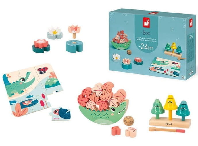 Box z zestawem zabawek edukacyjno-rozwojowych francuskiej marki JANOD przeznaczony jest dla dzieci od 24. miesiąca życia. Został opracowany stosownie do wieku we współpracy z terapeutą psychomotorycznym, aby wspierać rozwój funkcji poznawczych, niezbędnych do nauki panowania nad emocjami i logicznego rozumowania. W jego skład wchodzi: