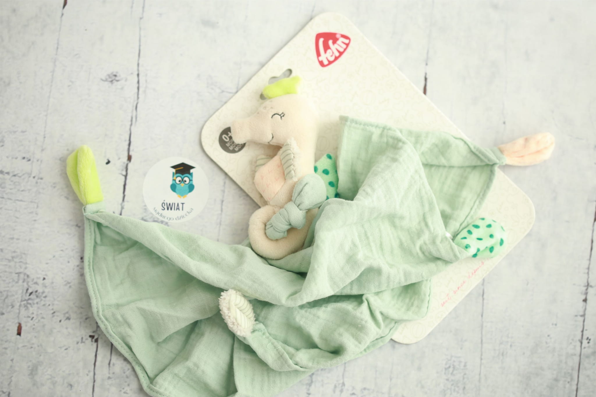 - Maskotka z konikiem morskim i bawełnianą mini-kołderką.