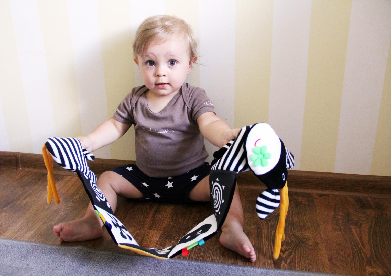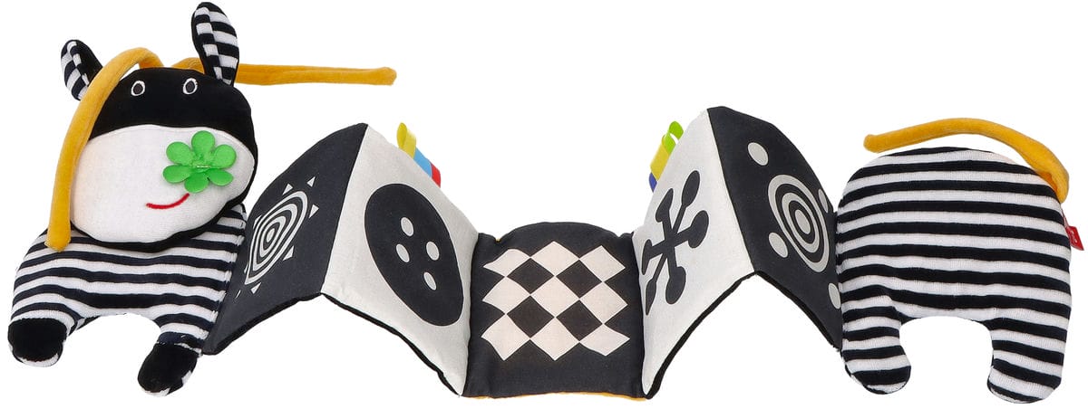 Mięciutka, materiałowo-harmonijkowa książeczka kontrastowa Króweczka Mom'care została stworzona z myślą o najmłodszych. To właśnie w pierwszym okresie życia dziecka kluczową rolę odgrywa stymulacja zmysłów. Wodzenie spojrzeniem i wpatrywanie się w zabawki rozwija zmysł wzroku oraz spostrzegawczość malucha. Do uszycia książeczek sensorycznych używamy bezpiecznych, przyjemnych w dotyku materiałów o różnej strukturze, które z pewnością zaciekawią badawcze paluszki. Dzięki temu dziecko poznaje świat i stymuluje zmysł dotyku. Nie zapominamy także o prawidłowym rozwoju zmysłu wzroku. Przewaga biało-czarnych, szeleszczących ilustracji trenuje spostrzegawczość i koordynację ruchową oko-ręka. Wraz z upływem czasu dziecko widzi coraz lepiej, więc można sięgać po zabawki w innych kontrastujących barwach.