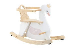 Łabędź na biegunach został wykonany z litego drewna. Z myślą o bezpieczeństwie siedzisko zabawki można zamknąć, aby uniknąć wypadnięcia z niej w trakcie bujania.