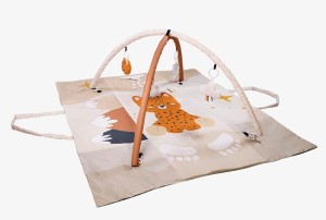 Mata edukacyjna do zabawy Lampart zapakowana jest w eleganckie, estetyczne kartonowe pudełko, co sprawia, że idealnie nadaje się na prezent dla niemowlaka.
