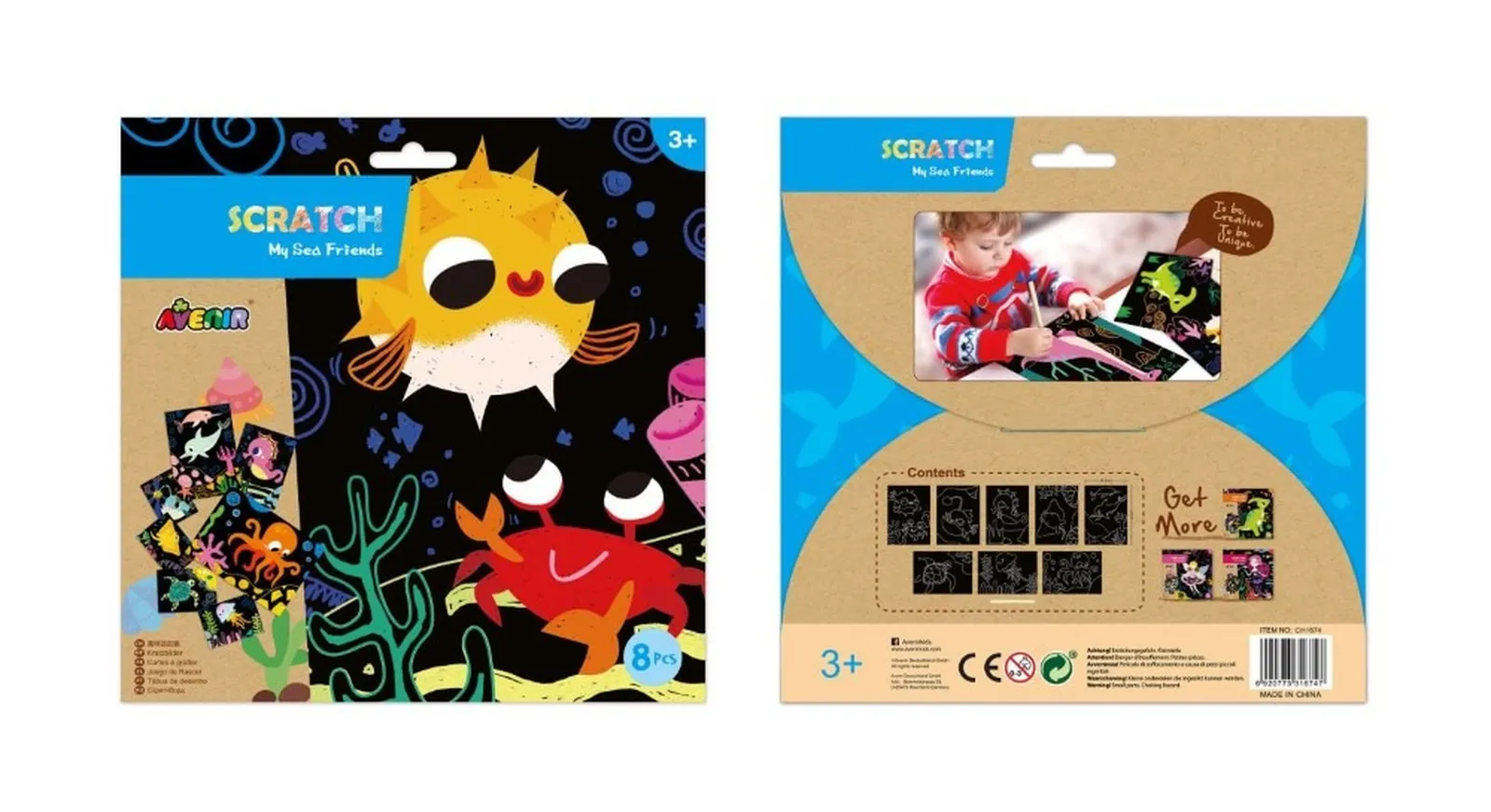 Avenir Scratch to zupełnie nowe podejście do prac ręcznych. Wyjątkowy arkusz, na którym tworzy się poprzez zdrapywanie warstwy wierzchniej, by odsłonić wielobarwną warstwę spodnią. Zabawka kreatywna najwyższych lotów, pozwalająca nie tylko tworzyć piękne prace, ale także dająca doświadczenia sensoryczne - dzięki użyciu odpowiedniego narzędzia i zachowywania się papieru podczas zabawy dziecko odbiera nowe wrażenia dotykowe. W zestawie są arkusze do zdrapywania z liniami pomocniczymi (8 szt.) oraz patyczek do zdrapywania. Dla dzieci powyżej 3. roku życia. Opakowanie: 23 x 23 cm.