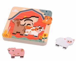 Drewniane puzzle wartstowe, które przedstawiają mieszkańców farmy dla najmłodszych od 18 m-ca życia to świetna zabawa. Poznawanie uroczych zwierząt z farmy z drewnianą, wielowarstwową układanką sprawia dzieciom mnóstwo radości! Puzzle posiadają 3 warstwy, zróżnicowane pod względem rozmiaru. Zadaniem dziecka jest umieszczenie zwierzątek we właściwych miejscach. Najmniejsze zwierzaki należy ułożyć na spodzie, a z każdą kolejną warstwą sięgać po większe puzzle. Zabawka stanowi idealne ćwiczenie dla małych rączek dziecka. To atrakcyjny sposób na poznawanie mieszkańców farmy, rozróżnianie pod względem nazw, kolorów i kształtów!