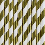 Słomki papierowe w kolorze złotym, metalizowanym z białymi ukośnymi paskami, to wspaniały dodatek do każdego przyjęcia! Podczas spotkania z bliskimi nie może zabraknąć posiłków, ani napojów, a słomki papierowe idealnie nadają się, by urozmaicić czas spędzony przy stole.