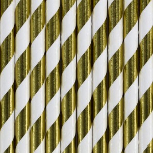 Słomki papierowe w kolorze złotym, metalizowanym z białymi ukośnymi paskami, długość ok. 19.5 cm. Towar nie może być sprzedawany na terytorium RFN i Szwajcarii, w związku z wewnętrznymi regulacjami prawnymi Niemiec i Szwajcarii. Towar zgodny z przepisami Unii Europejskiej.(1 op. / 10 szt.)