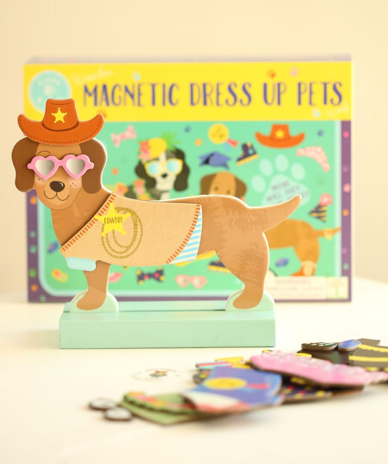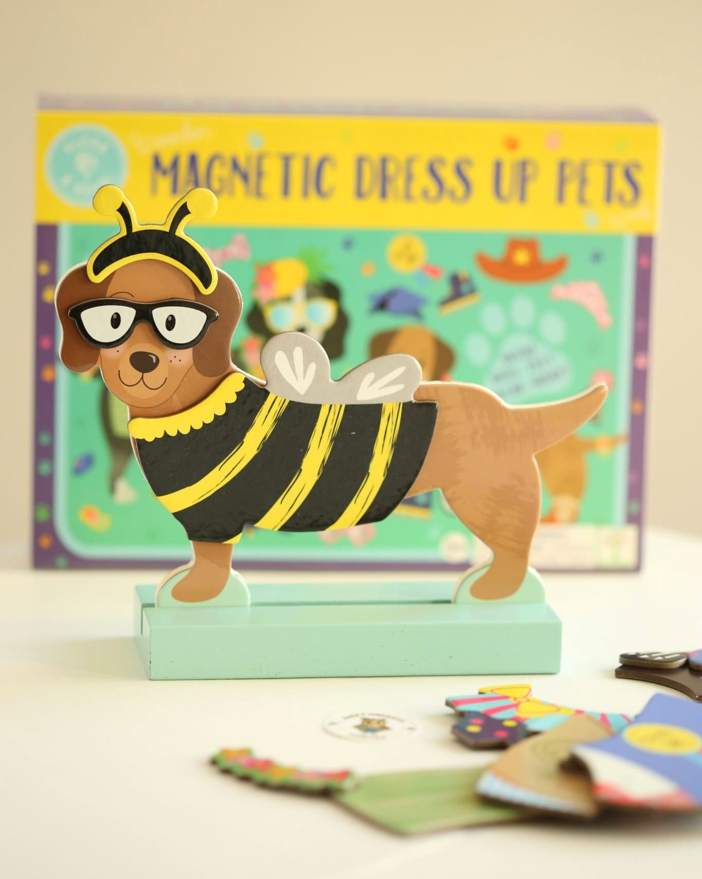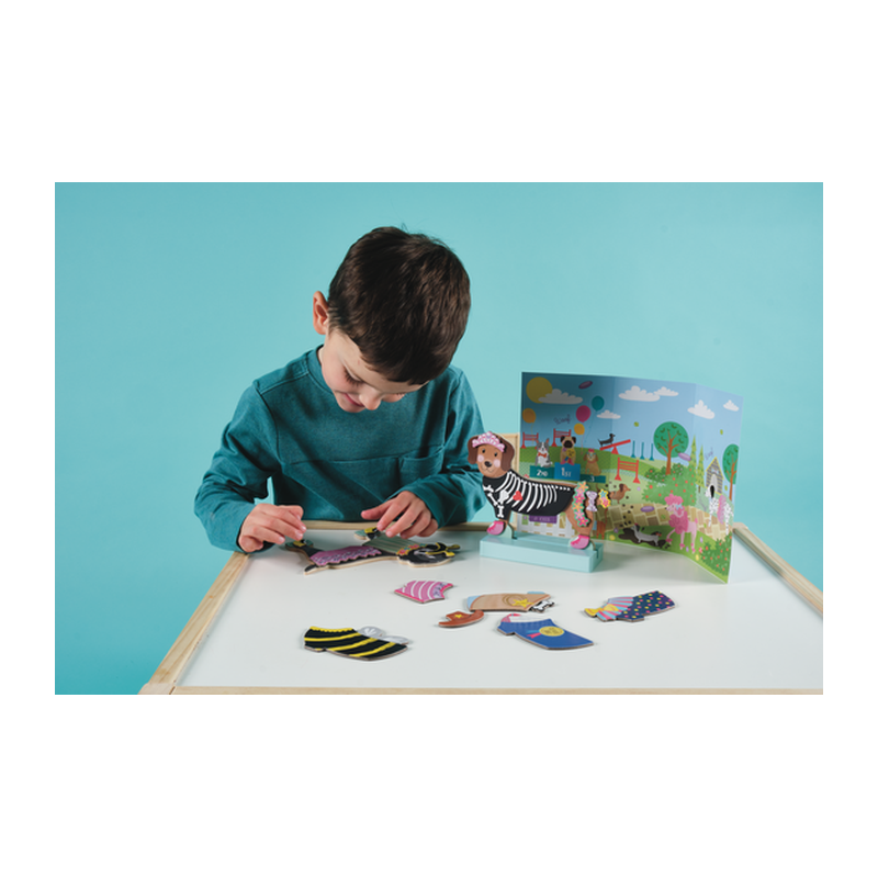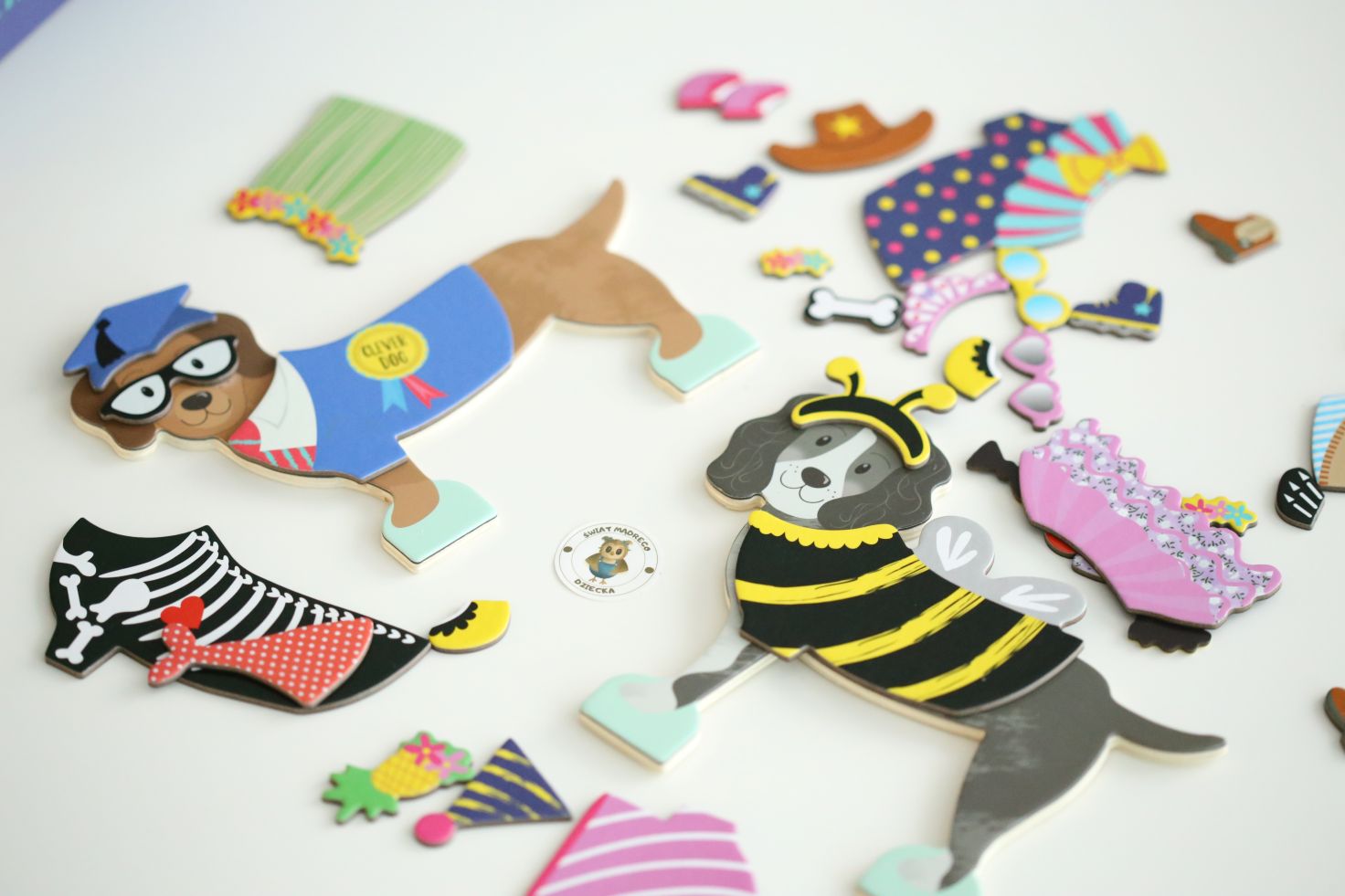 Magnetyczna układanka kreatywna Zwierzaki - Pieski to niesamowita przygoda i gwarancja dobrej zabawy! Zawiera słodkiego spaniela i super jamnika, 6 wymiennych strojów dla obu psiaków i liczne akcesoria, co daje nieskończone możliwości przebierania. Do zestawu dołączona jest drewniana podstawka i dwustronne tło, idealne do kreatywnej i pomysłowej zabawy. Zestaw jest idealny do zabawy w pojedynkę lub z przyjaciółmi i świetnie sprawdzi się w podróży.